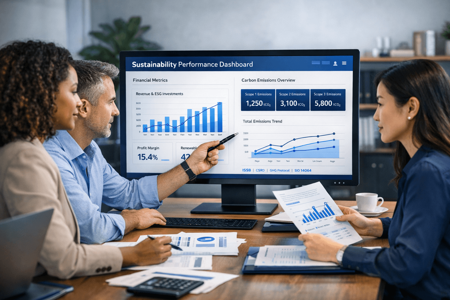 Turn your benchmarking analysis into professional, compliance-ready reports that meet UK SRS, SECR, and ISO 14064 standards. These reports should not only reflect your firm's professionalism but also align the sustainability narrative with financial statements. This means linking governance decisions, climate risks, and strategic initiatives to production costs, investments in eco-friendly technology, and asset expenditures.