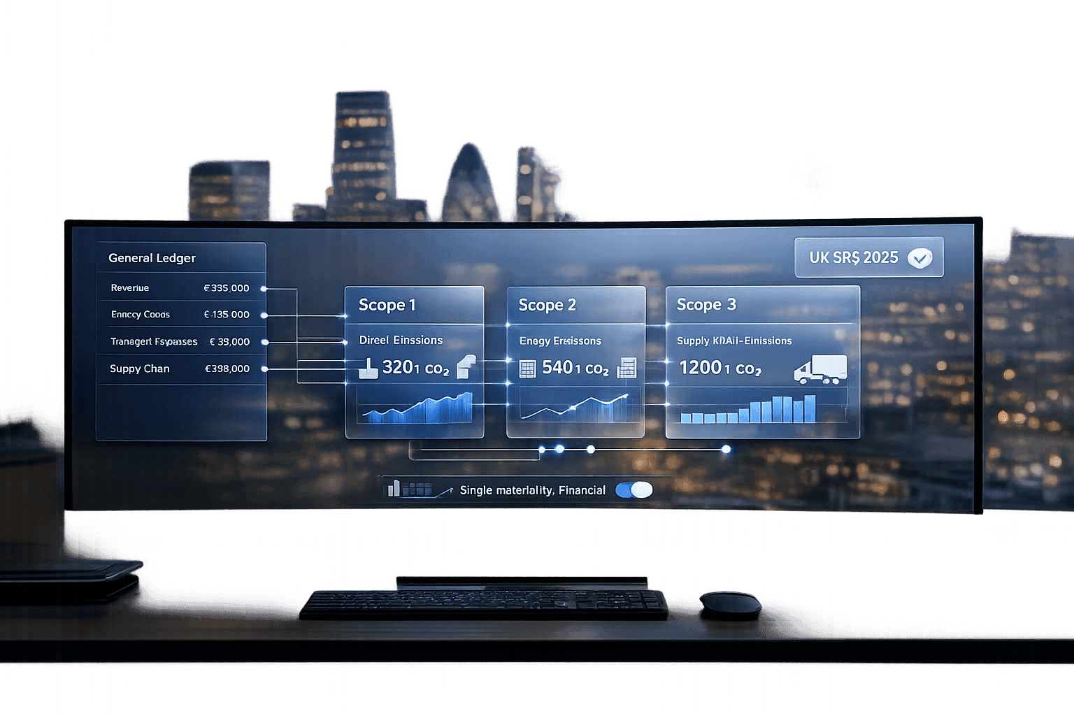 Covers UK SRS requirements from 2026 for large organisations, the single‑materiality focus, and how integrated tools map financial ledgers to Scope 1–3 emissions.