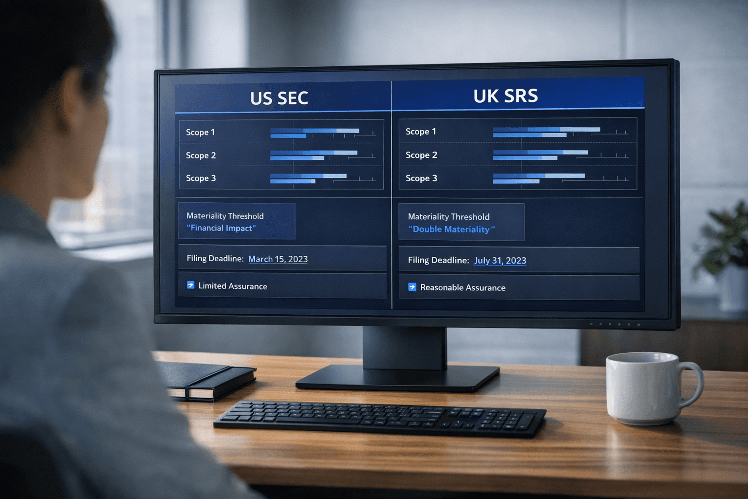 Compare SEC and UK SRS materiality rules for climate and sustainability reporting: thresholds, Scope 1-3, assurance and filing deadlines.